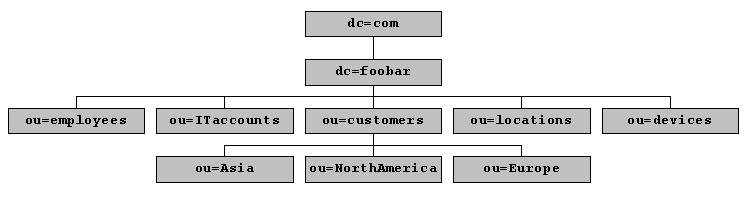 The better your initial directory structure, the less likely it is to need revamping later. In general, you'll want to design your directory so individual entries won't have to be moved from one tree to another. You'll probably find that a fairly shallow structure works best, one where each branch of the tree contains objects that are unlikely to move much, if at all. Consider the following, a directory tree for the fictional foobar.com. They've taken about a year rolling out their LDAP directory in stages, gradually basing more and more services on LDAP along the way.